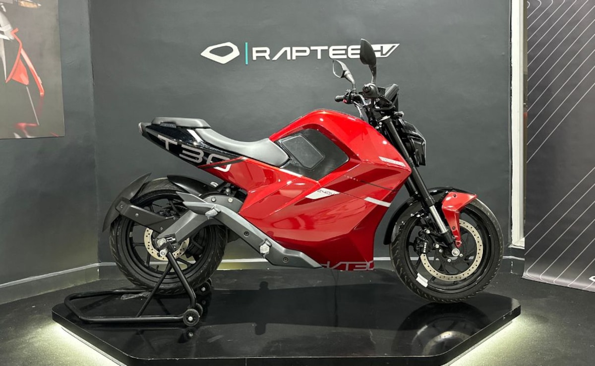 Left: Concept render of Raptee's electric motorcycle. Right: Rear view highlighting compact drivetrain packaging.